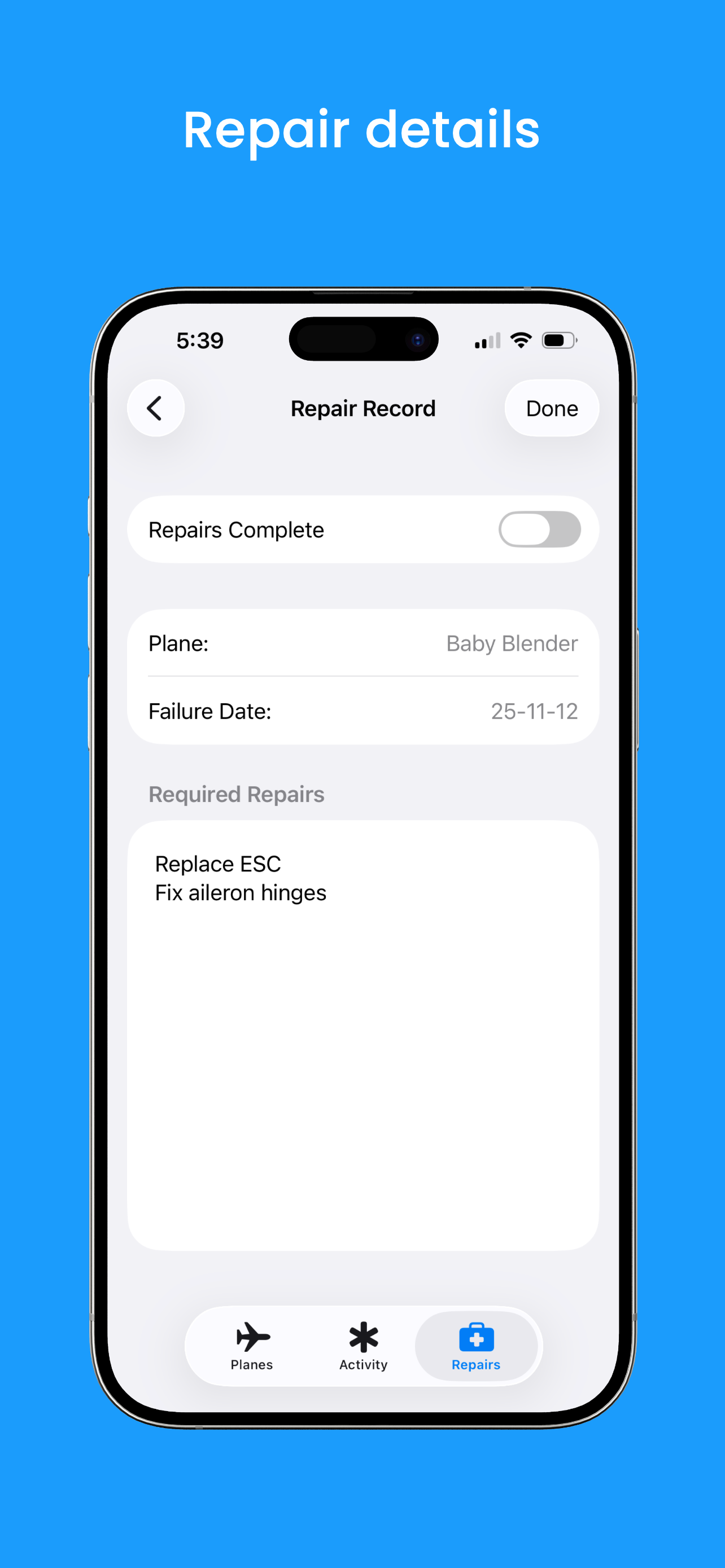 Selecting a plane in repair will present the user with the repair record. This record can be updated for status on interim repairs, or marked as completed. When completed the plane is returned to "ready to fly" status and the record is closed.