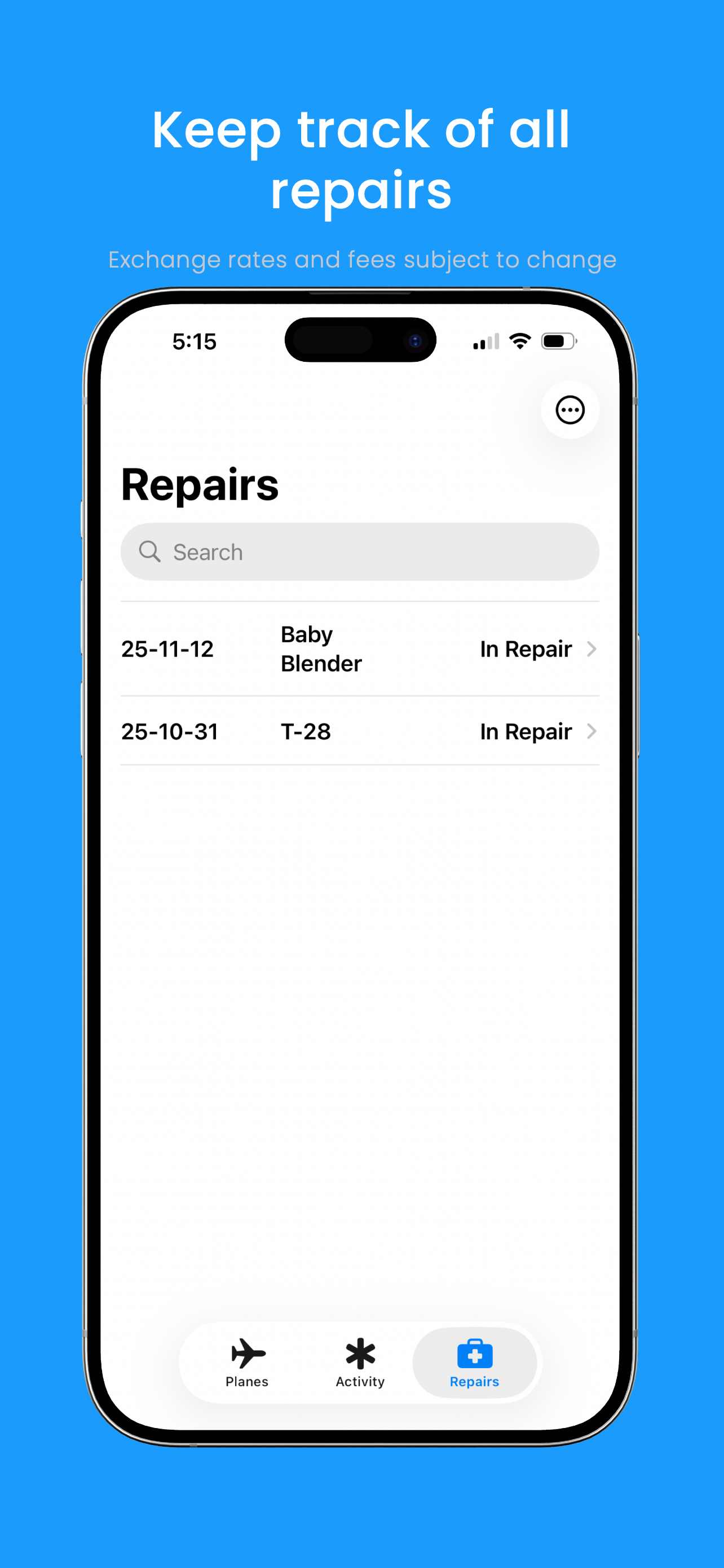 When the repairs option is chosen, users are presented with a list of all planes currently in repair. Optionally, you can select repair history for a list of all previously completed repairs
